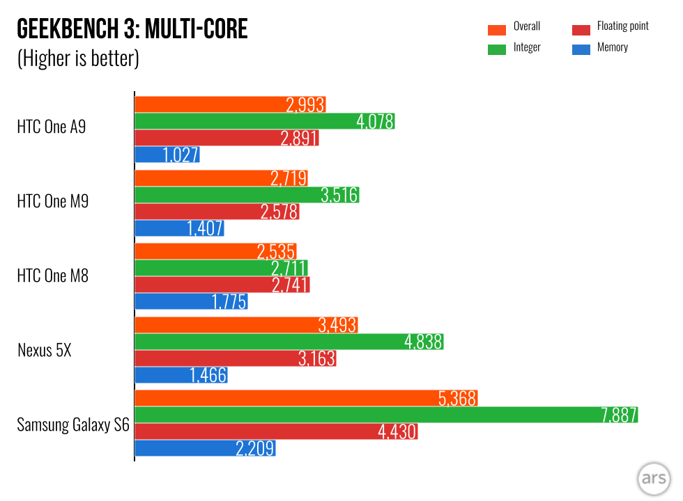 The A9's performance won't blow your socks off—particularly if you're into your benchmarks—but in day-to-day use it's fast enough, and won't melt through your hand in the same way that those early M9s did. The Snapdragon 617 gives you eight 64-bit A53 cores in total (the A53 being the lower-power cores used in the Snapdragon 810 of the M9), four running at 1.5GHz, and another four at 1.2GHz, along with an Adreno 405 GPU. Oddly enough, in Geekbench, the A9 actually beat the M9 in the multicore test. This could be a result of the M9's heavy throttling at work, or it could be Android Marshmallowgiving it something of an advantage. Regardless, it's not a huge victory, and in all other tests, the A9 comes in at the bottom of the pack.